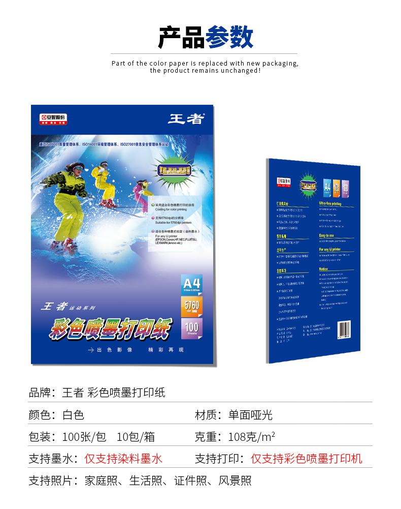 王者 A3 彩噴紙108克運(yùn)動(dòng)型新包裝彩色噴墨打印紙噴墨專用紙 100張/包