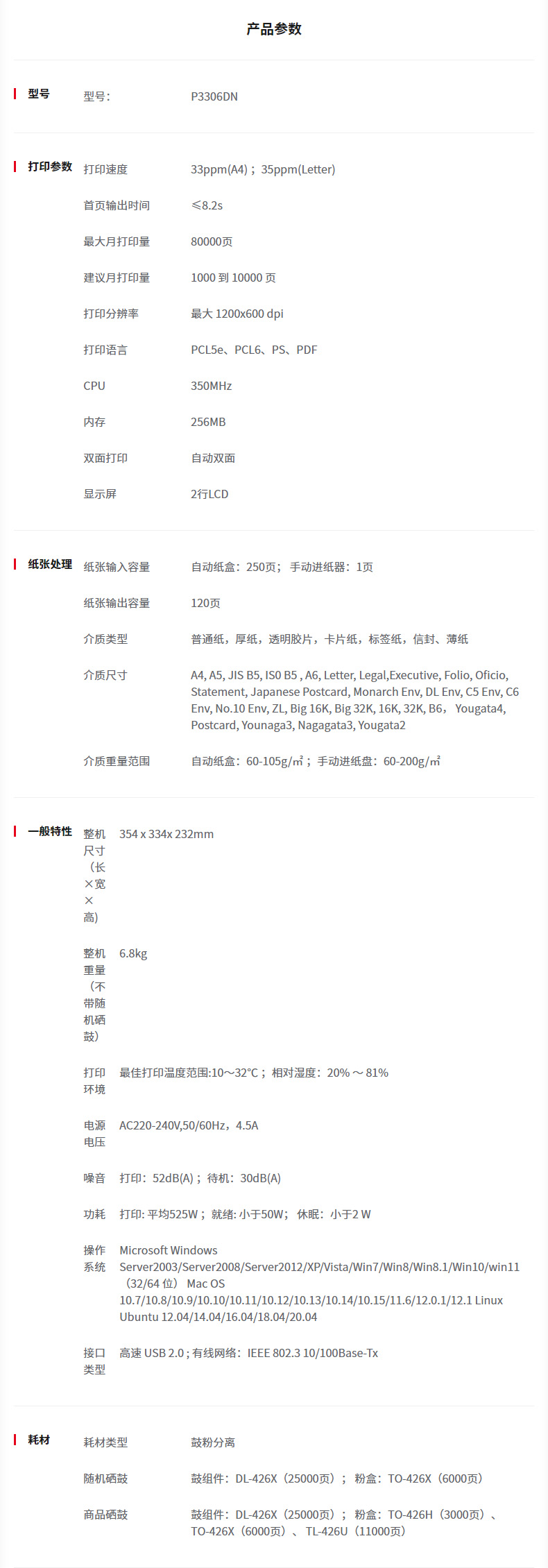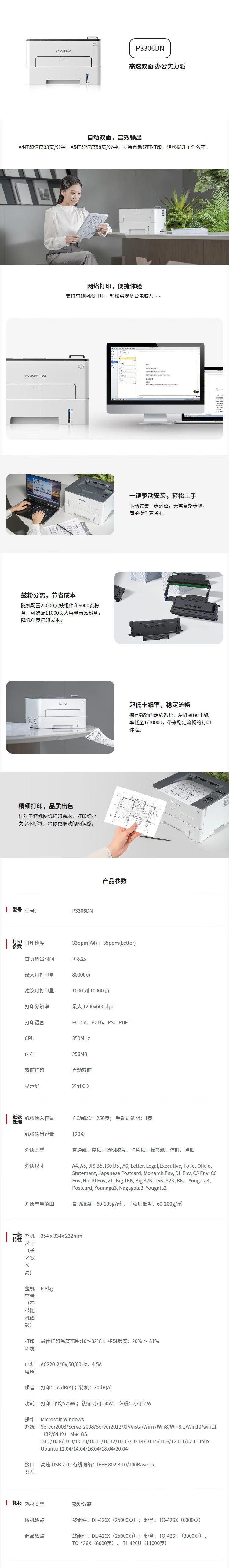 奔圖(Pantum)P3306DN A4黑白激光單功能打印機