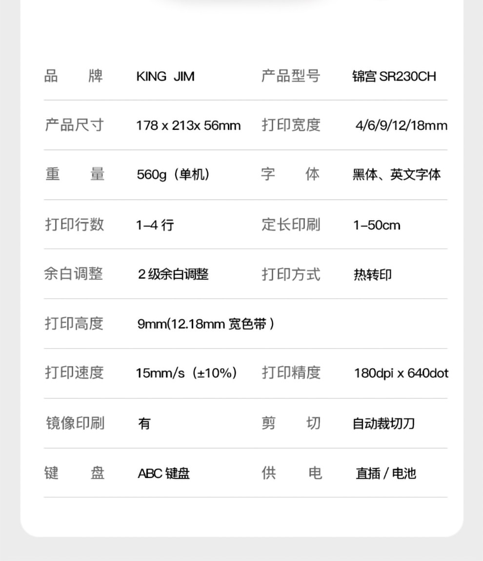 錦宮(King Jim) SR230CH標(biāo)簽機(jī) 自動(dòng)剪切余白調(diào)整 辦公通信線(xiàn)纜4-18mm打印 白色