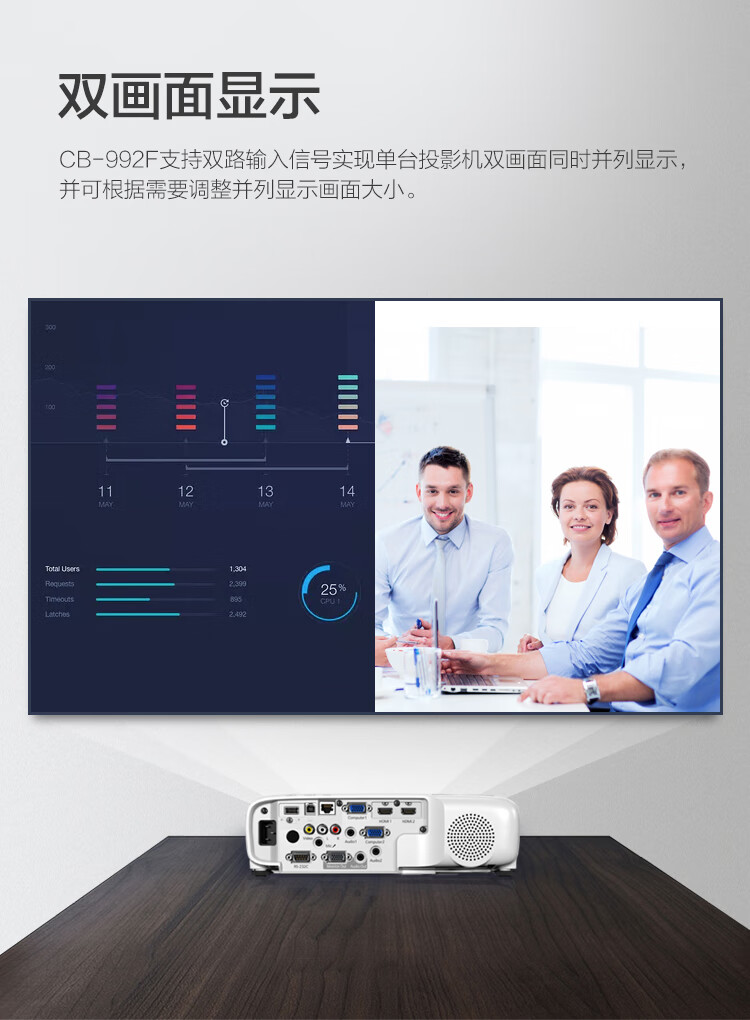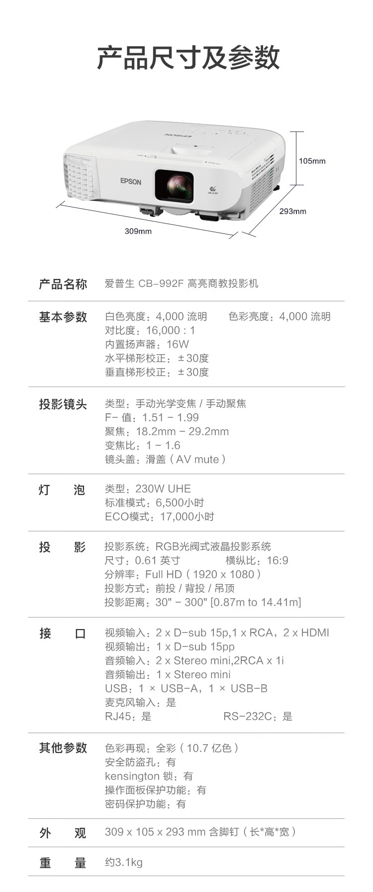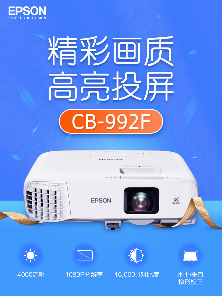 愛(ài)普生(EPSON) 會(huì)議專業(yè)投影儀 工程商務(wù)會(huì)議辦公商用教育培訓(xùn)超清超亮 無(wú)線同屏大型會(huì)議投影機(jī) CB-992F [4000流明 雙高清接口]
