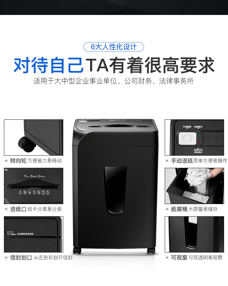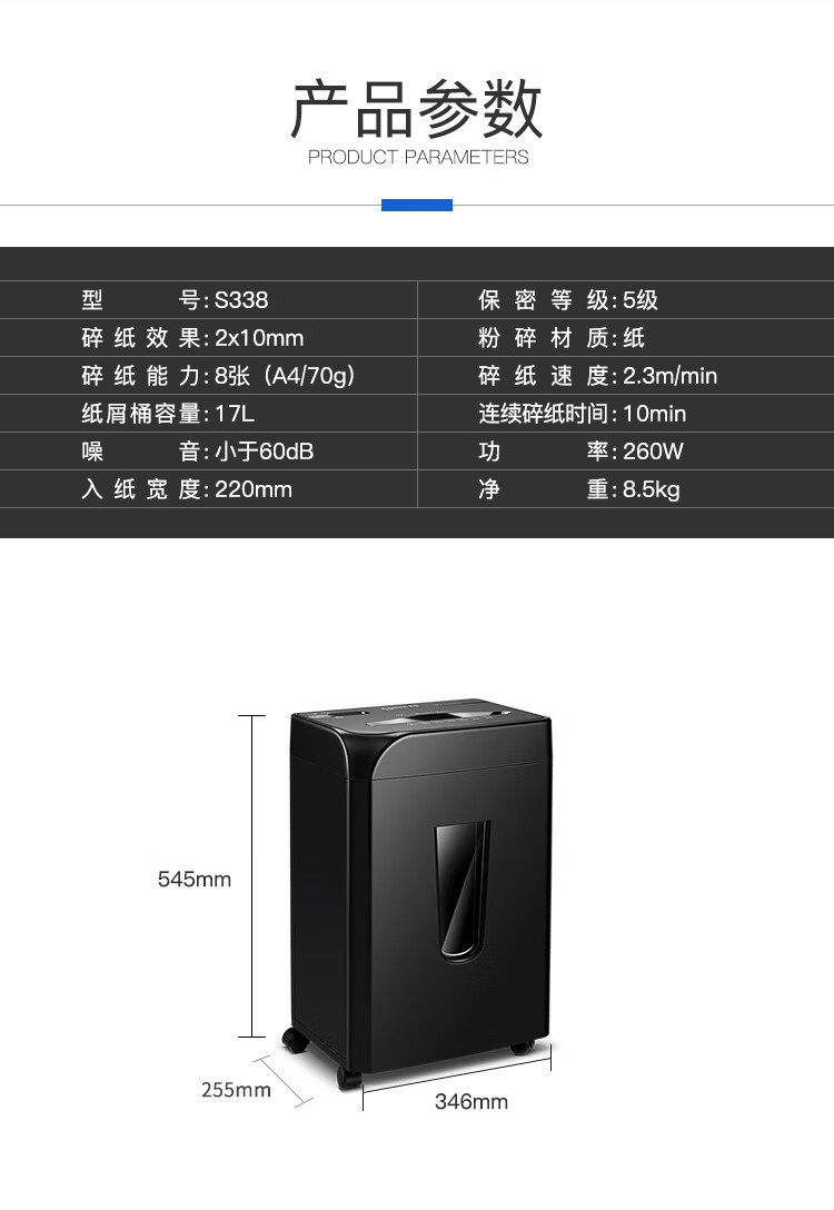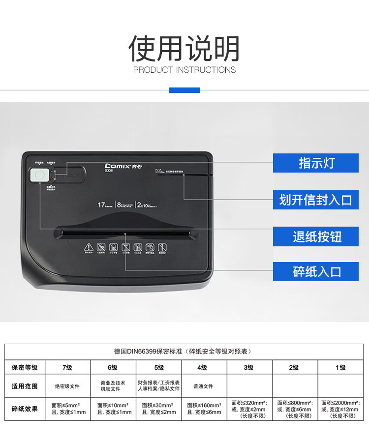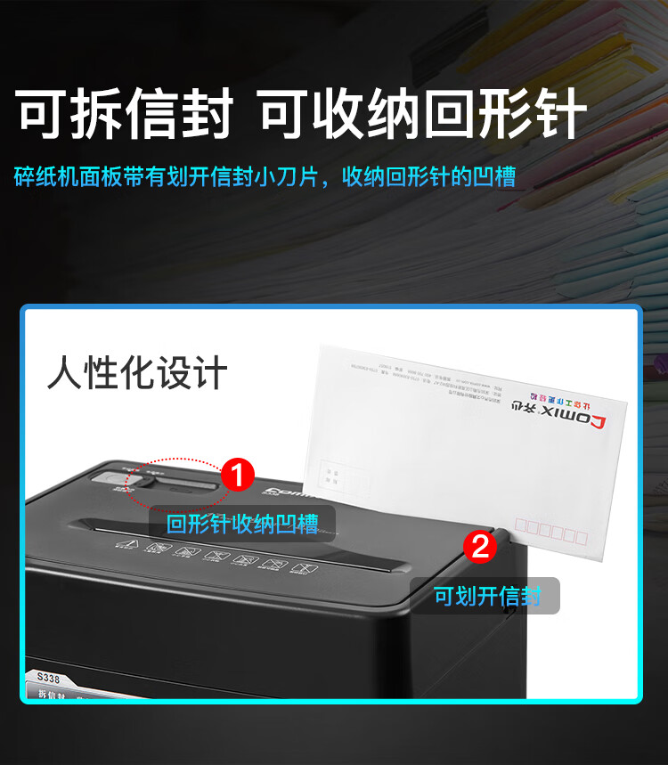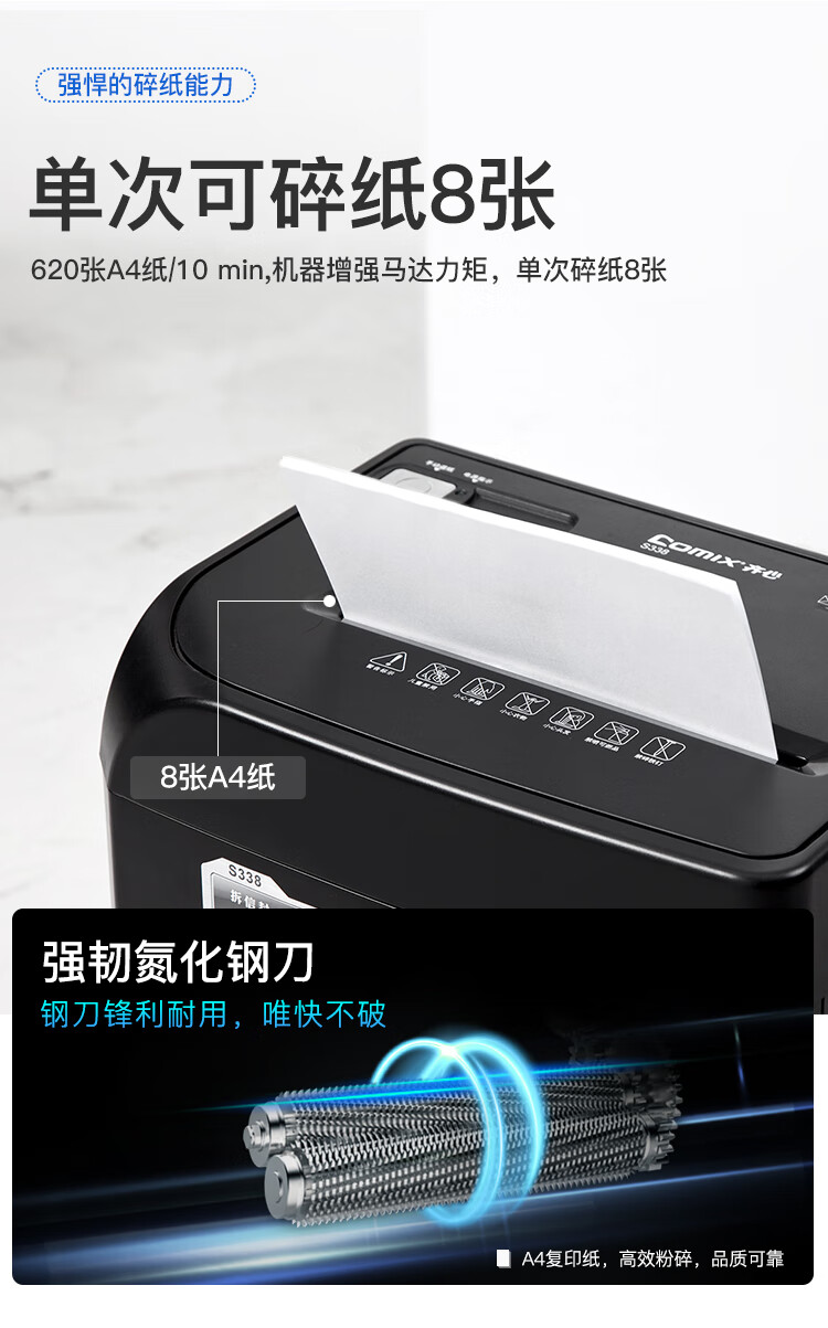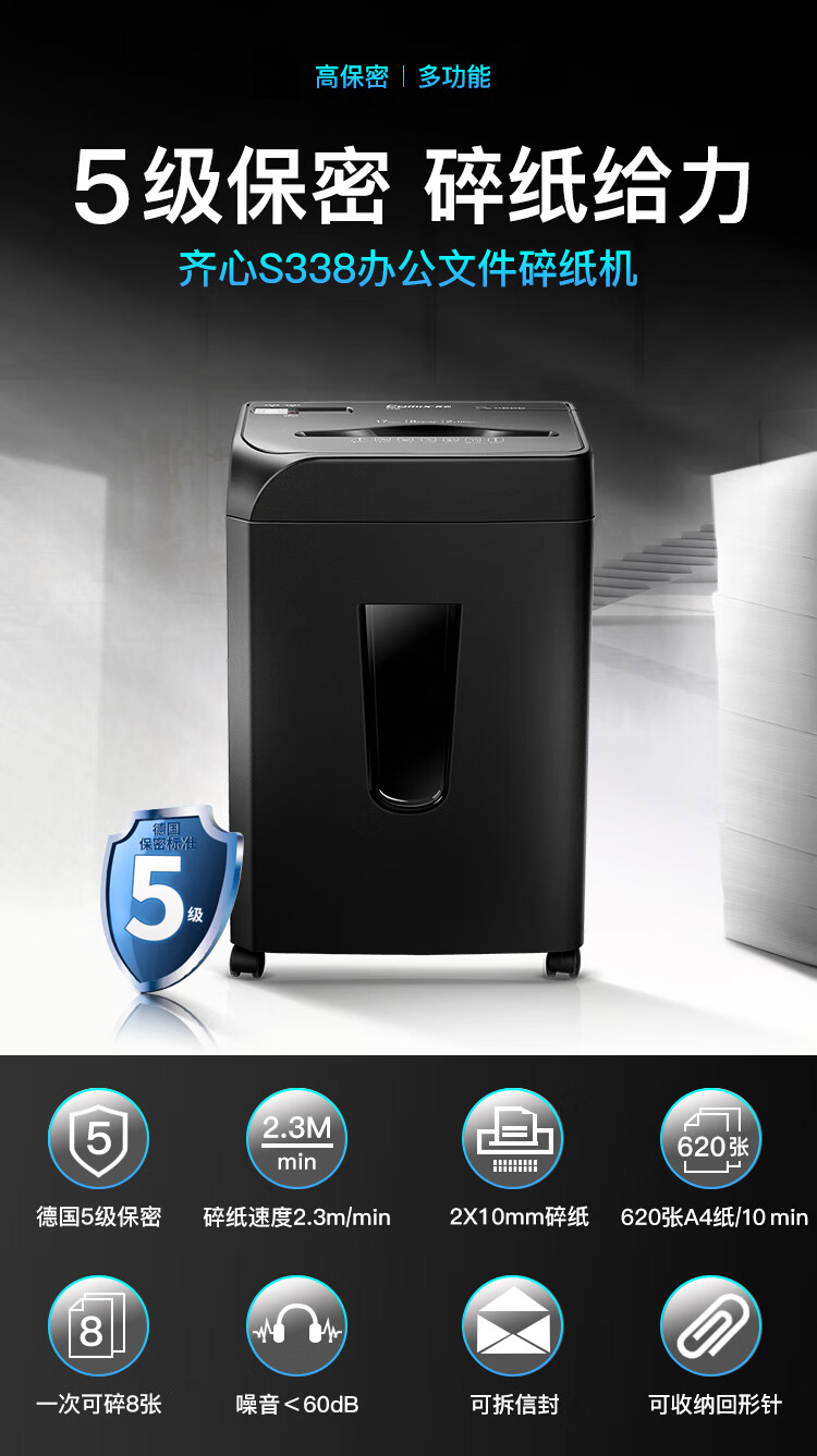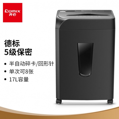 齊心(Comix)碎紙機(jī) 德國(guó)5級(jí)保密碎紙機(jī)單次8張續(xù)航10min半自動(dòng)文件粉碎機(jī)17L S338(碎紙/可拆信封) 計(jì)價(jià)單位:臺(tái)