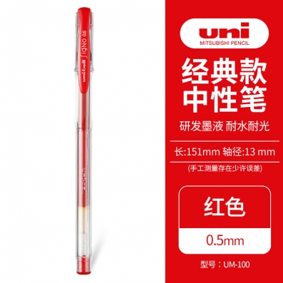 三菱(Uni)UM-100學生中性筆簽字筆 0.5mm雙珠防漏墨啫喱筆考試經(jīng)濟型水筆(替芯UMR-5) 紅色 計價單位:支