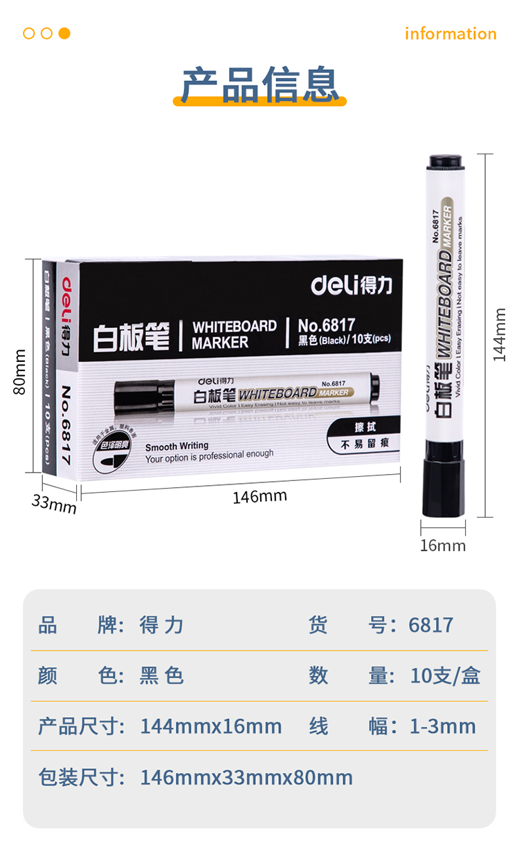 得力(deli)白板筆 色澤明亮可擦易擦 黑色 6817(新老款隨機發(fā)貨)
