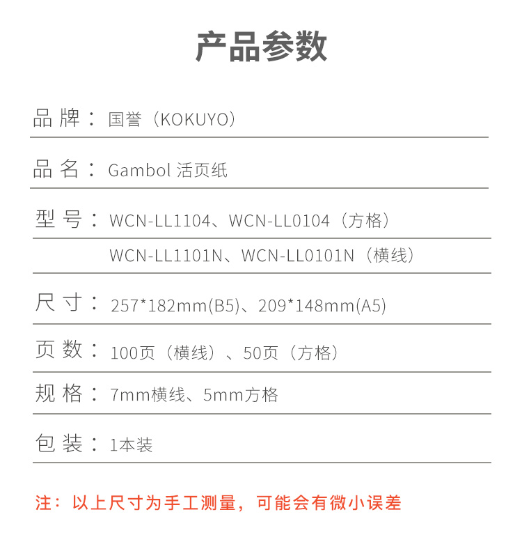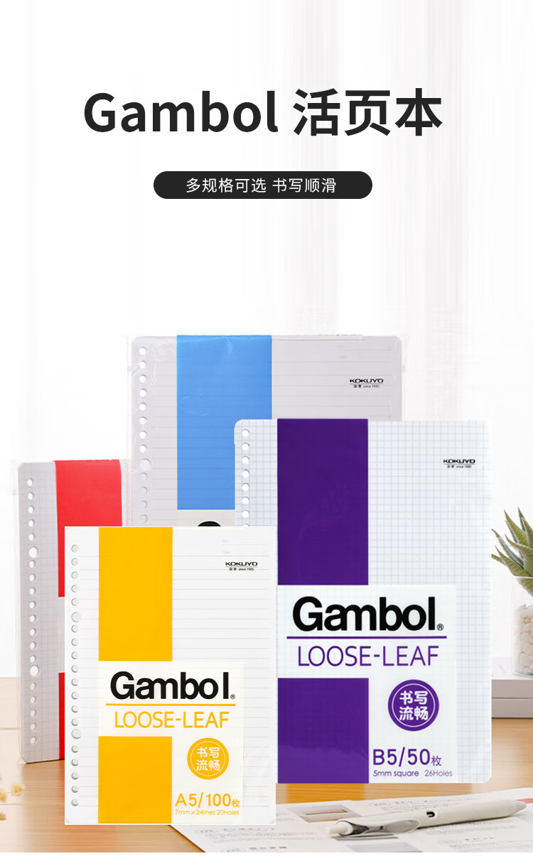 國譽(KOKUYO)B5活頁紙Gambol渡邊活頁本替芯筆記本子活頁紙內(nèi)頁 7mm橫線 100張1本 WCN-LL0101N