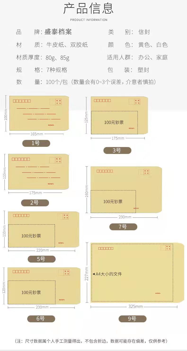 盛泰檔案牛皮紙信封郵局標(biāo)準(zhǔn)常規(guī)信封工資袋增值稅發(fā)票信封 9號信封【黃色】 100個/包