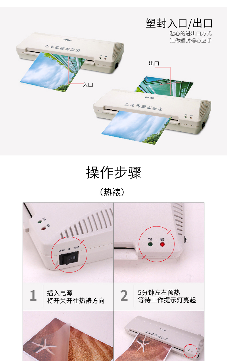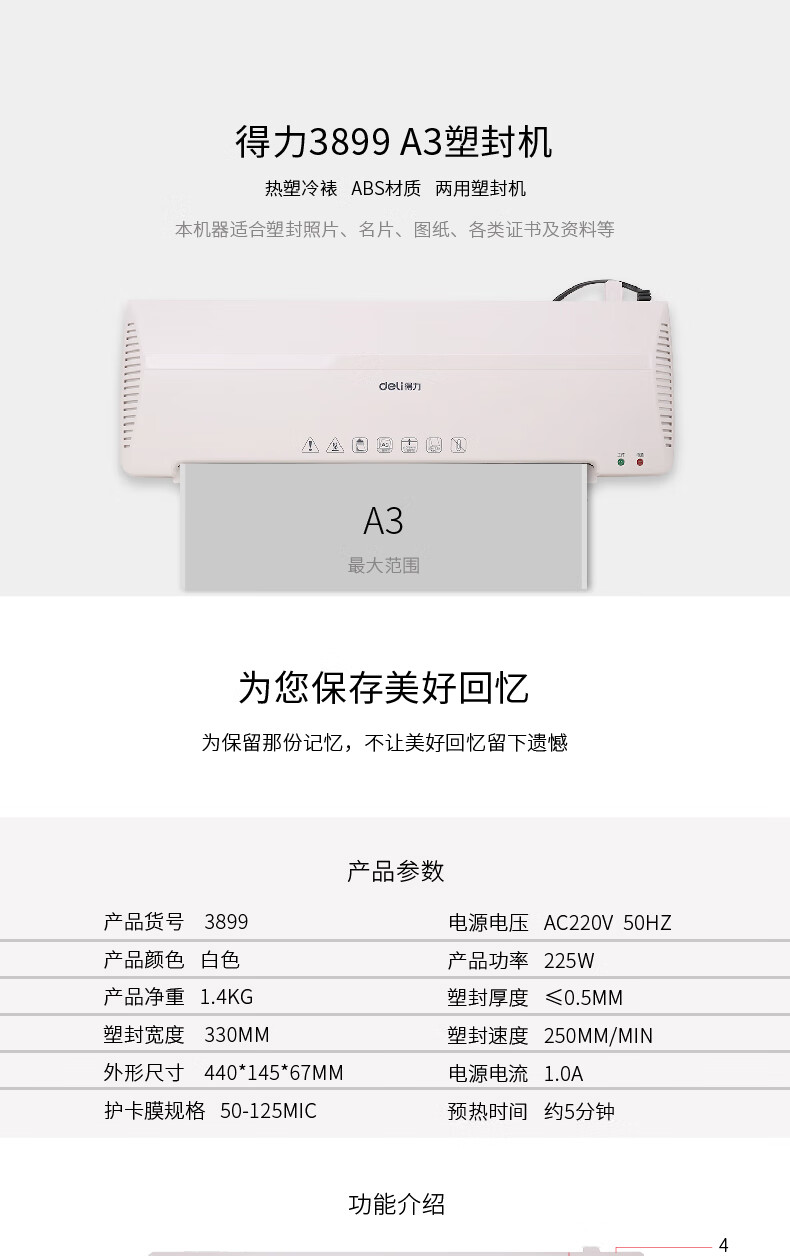 得力(deli)家用膠裝機過膜機 過塑膜A3/A4家用照片塑封機 過膠機 菜單文件照片覆膜過塑機3899(黑白混發(fā)) 計價單位:臺