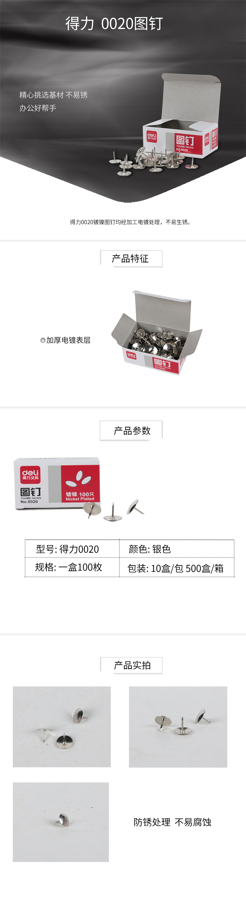 得力(deli)0020圖釘 得力圖釘 鍍鎳 金屬大頭釘 圖畫釘