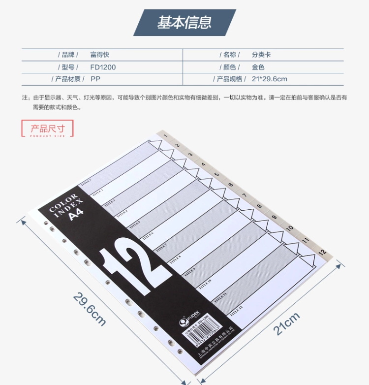 富得快 隔頁紙 FD-1200 A4 12頁PP彩色索引紙 塑料分頁紙 膠質(zhì)分類卡 數(shù)字分頁紙