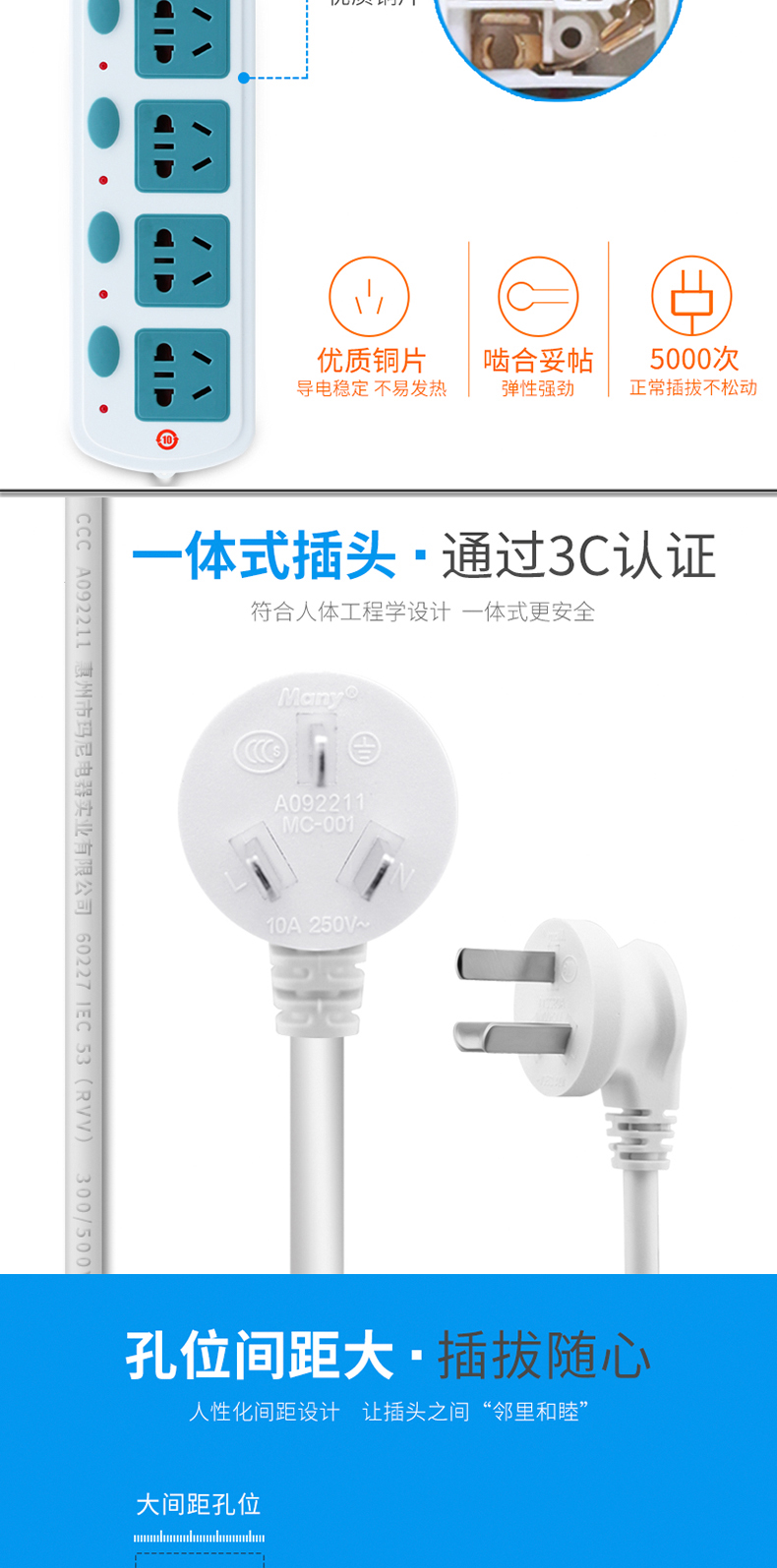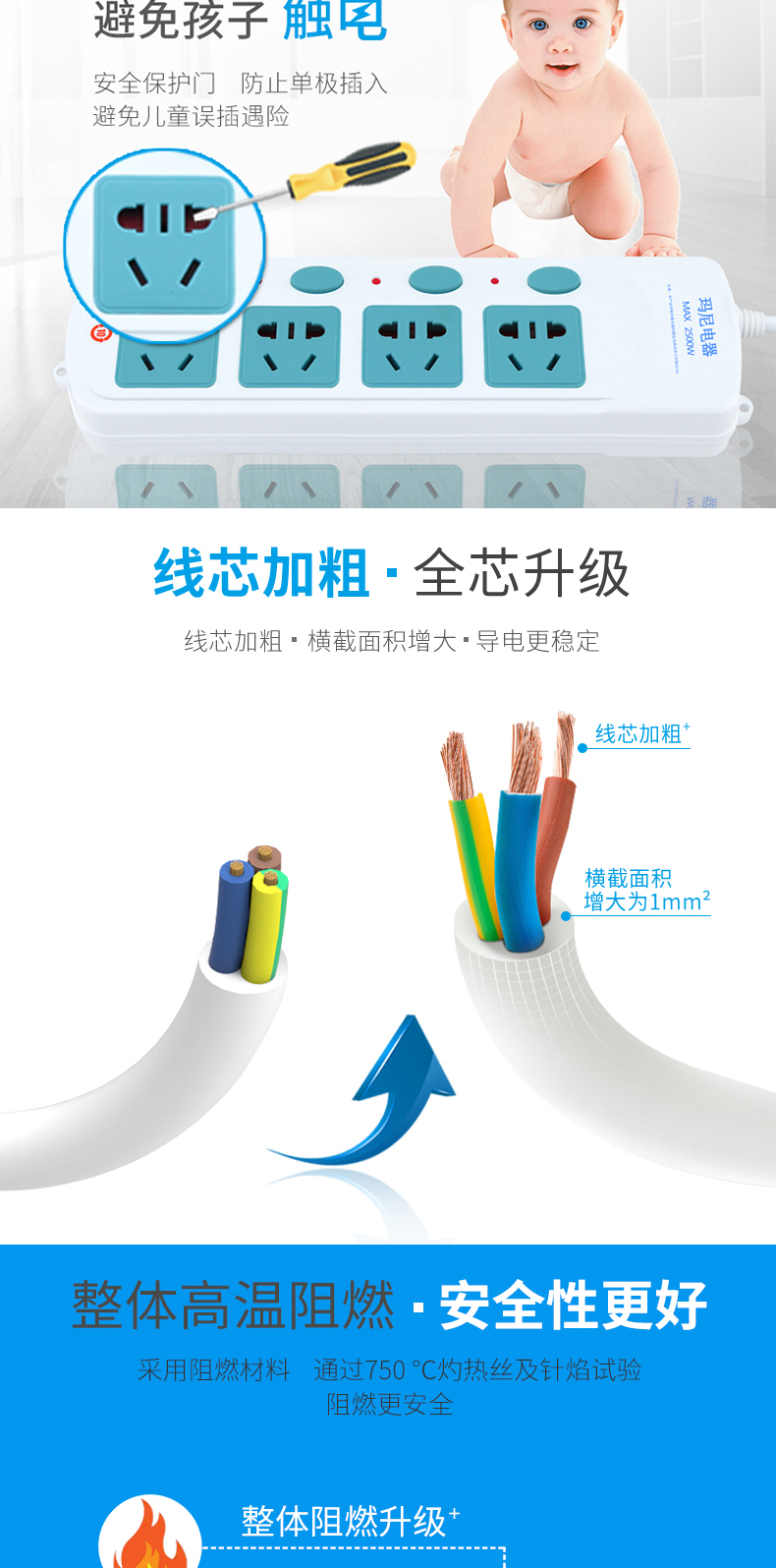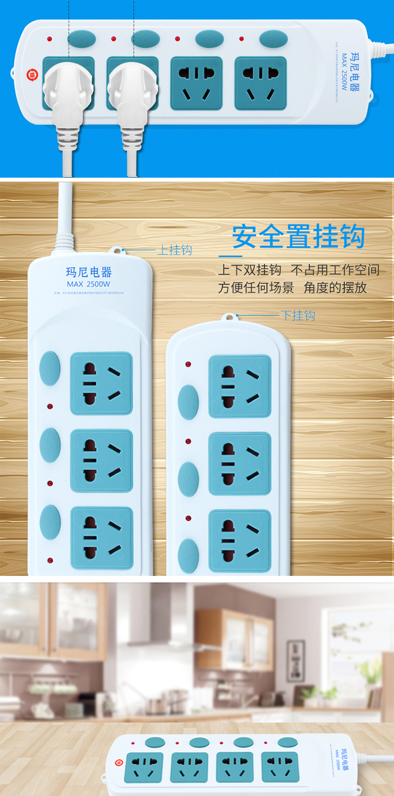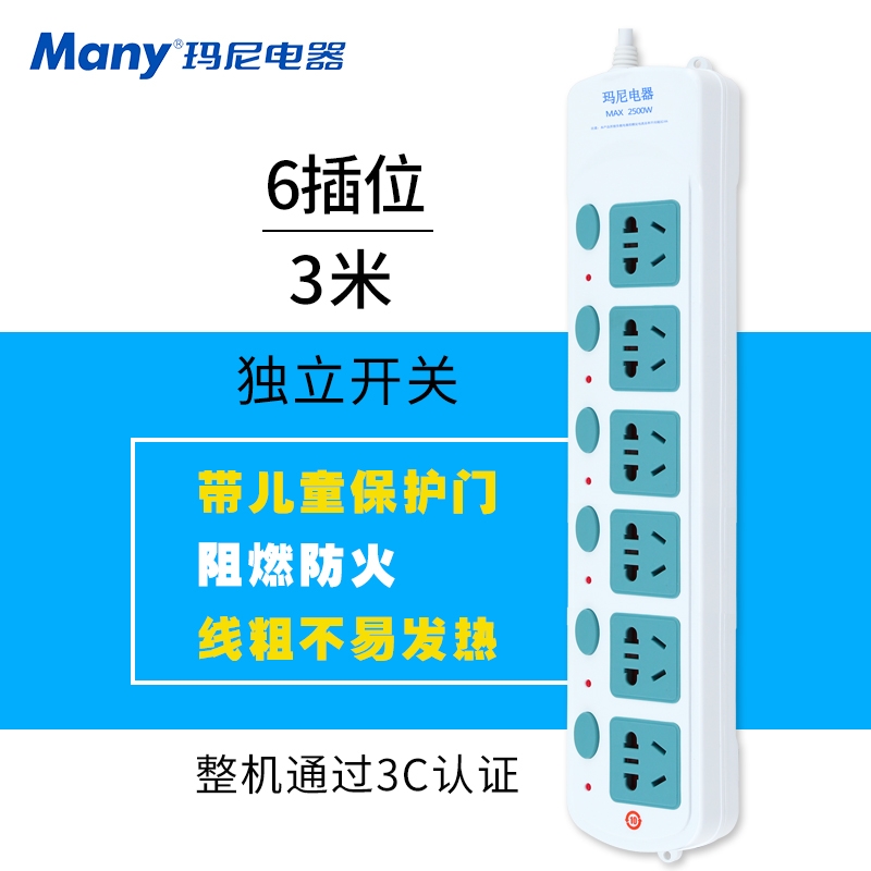 瑪尼插座獨(dú)立開關(guān)帶保護(hù)門電源插排插線板插板接線板拖線板插座MT-B463 3米6位