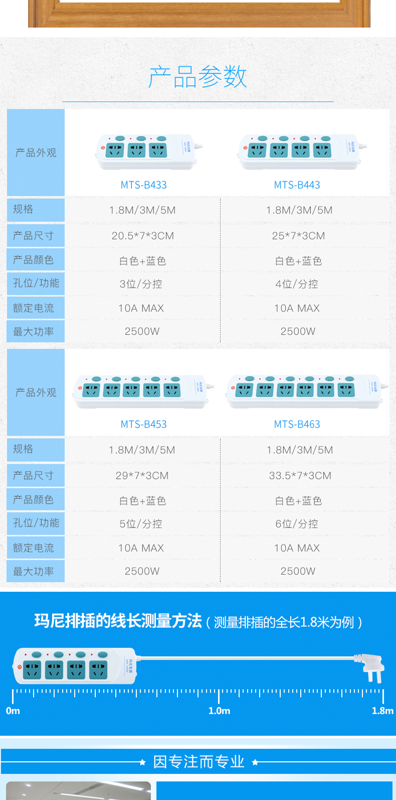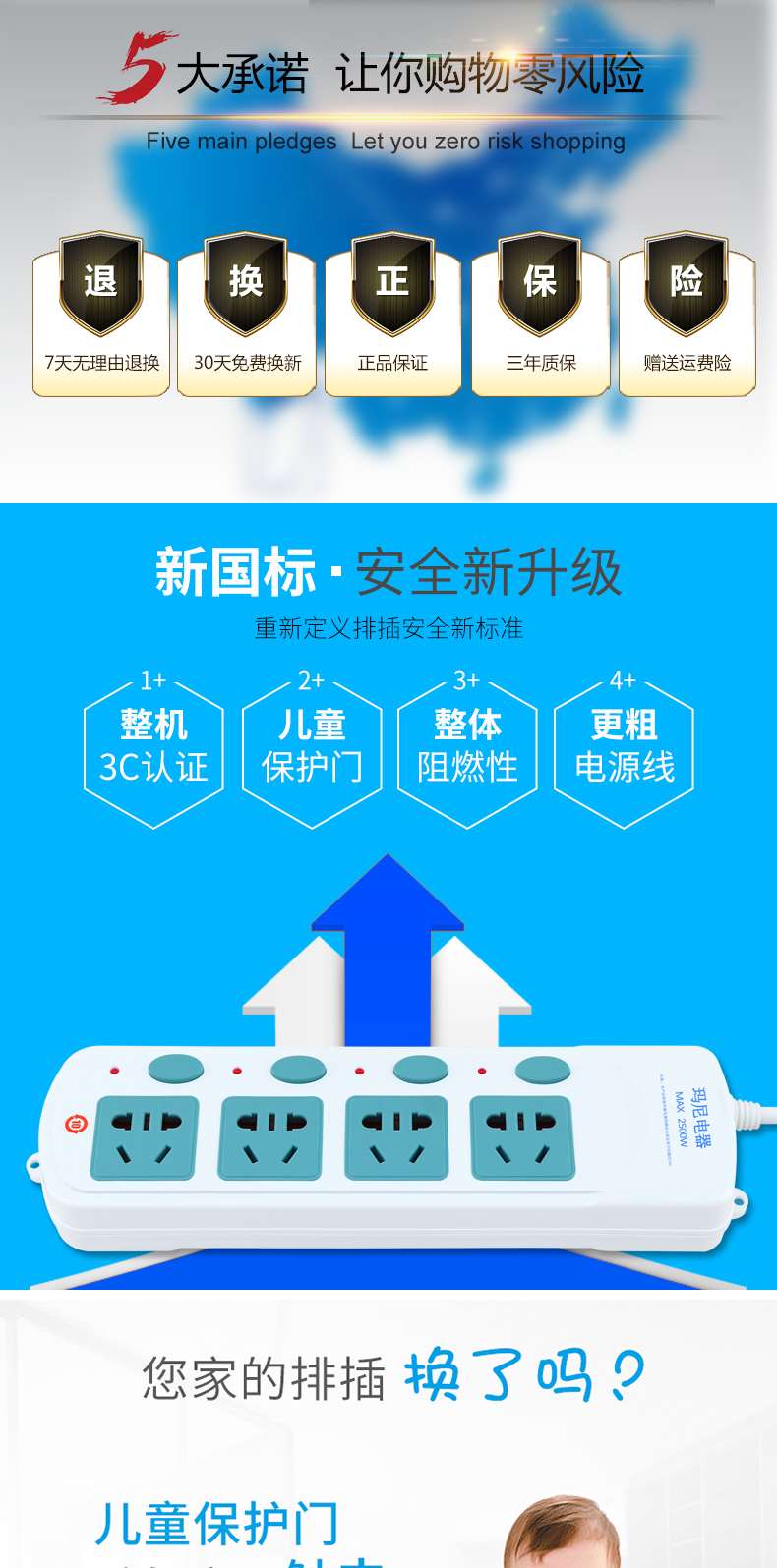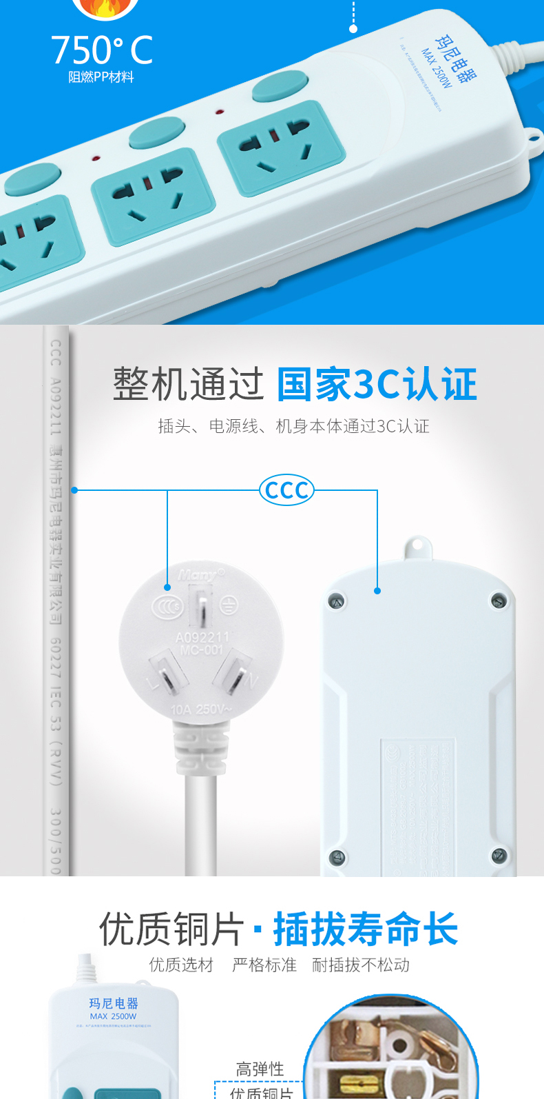 瑪尼插座獨(dú)立開關(guān)帶保護(hù)門電源插排插線板插板接線板拖線板插座MT-B463 3米6位
