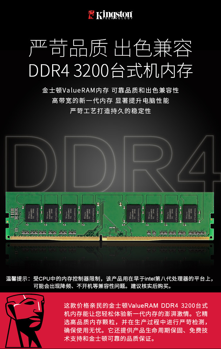 金士頓 (Kingston) 16GB DDR4 3200 臺(tái)式機(jī)內(nèi)存條 經(jīng)典款