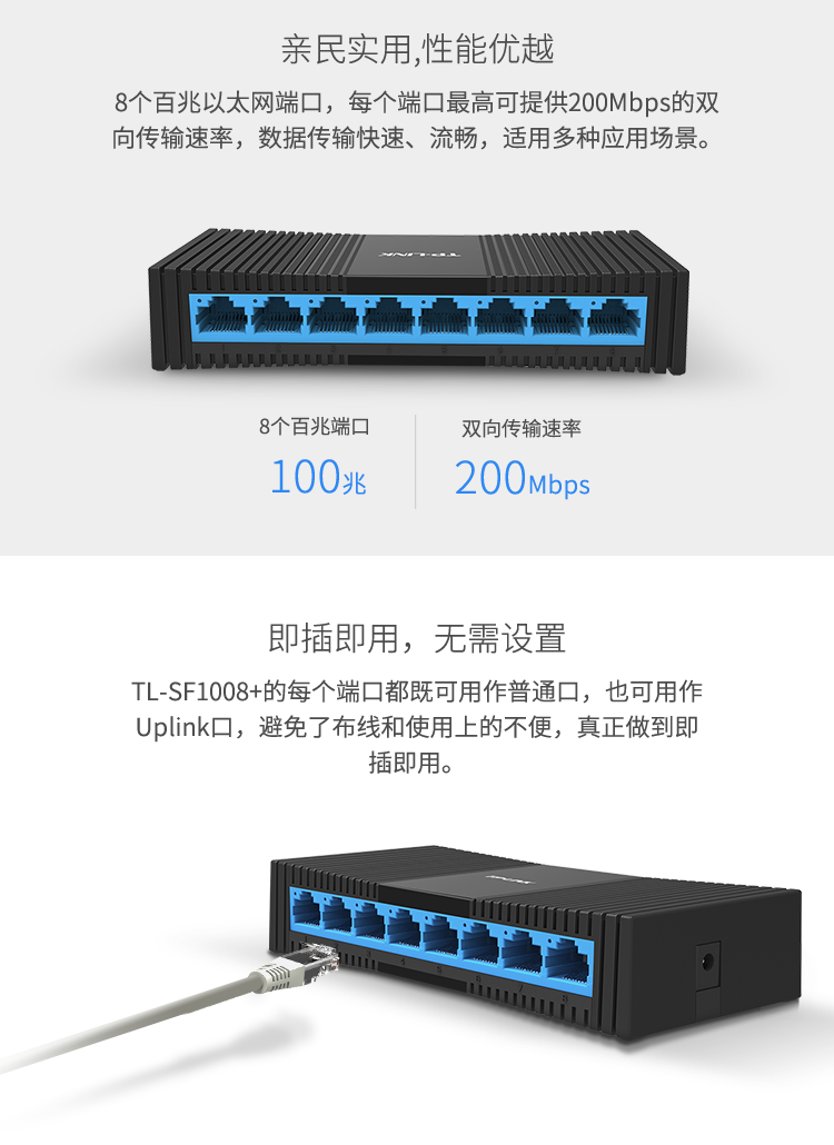 TP-LINK 8口百兆交換機(jī) 監(jiān)控網(wǎng)絡(luò)網(wǎng)線分線器 家用宿舍分流器 TL-SF1008+ 計(jì)價(jià)單位:個(gè)