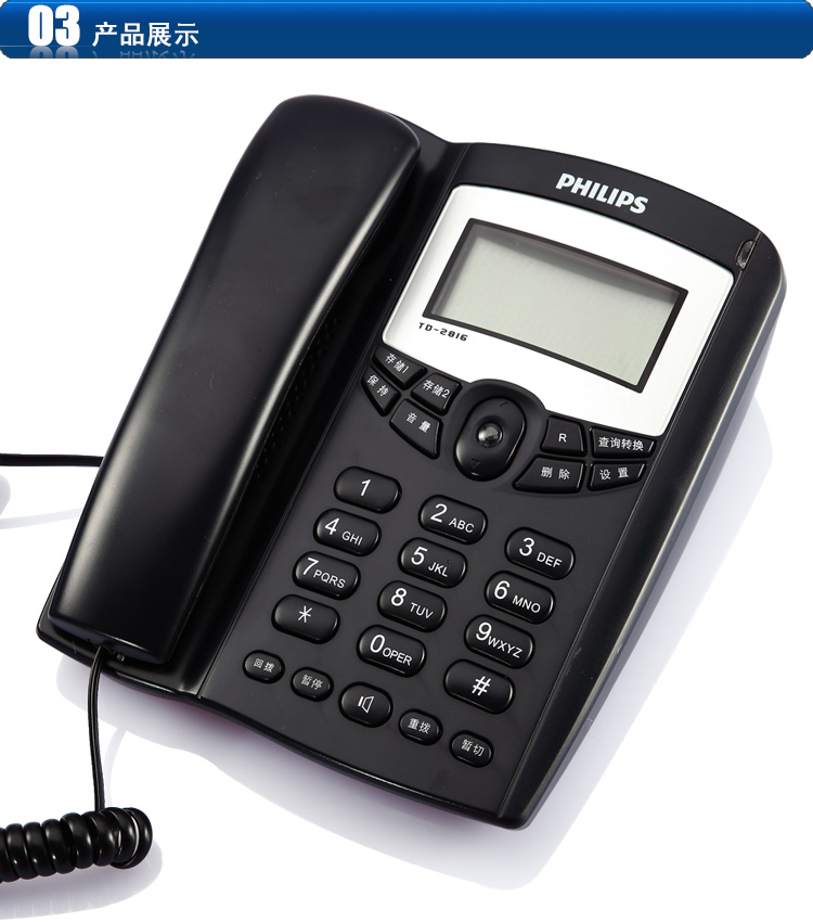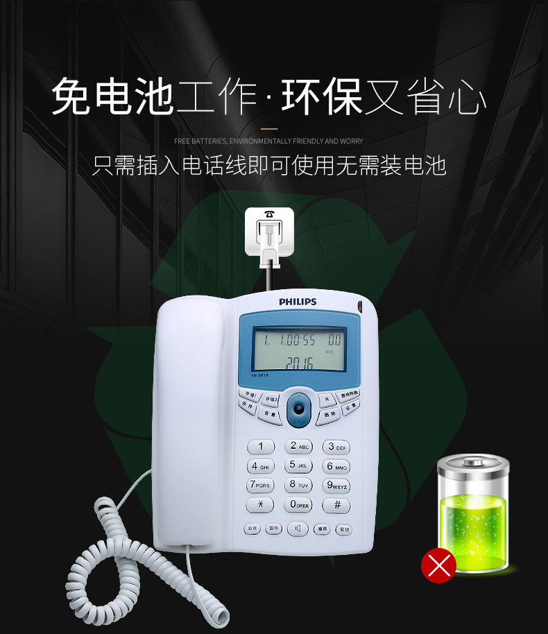 飛利浦(PHILIPS)電話機(jī)座機(jī) 固定電話 辦公家用 免電池 來電顯示 雙插孔 TD-2816 黑色