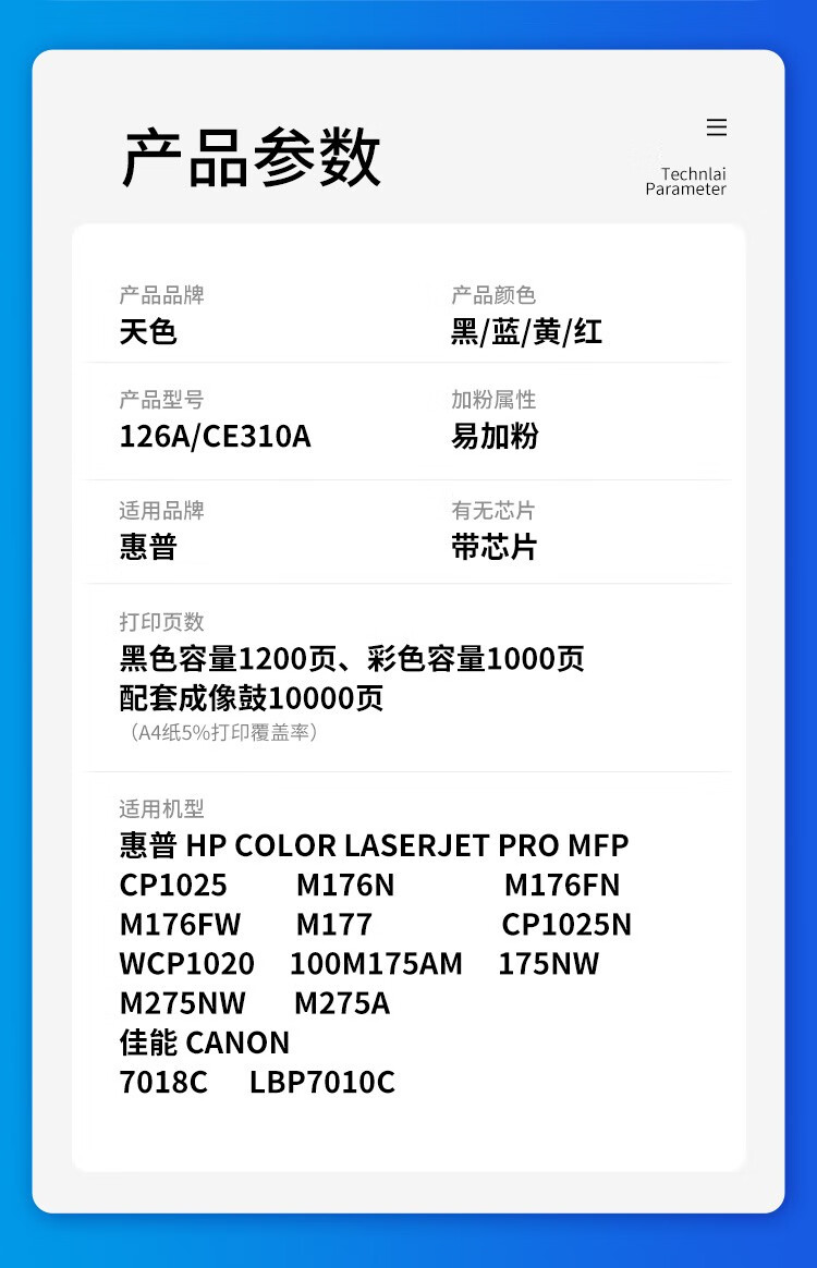 天色CE311a/CF351a藍(lán)色硒鼓/易加粉(1000頁)適用惠普CE310粉盒m176n硒鼓m177fw cp1025nw CF350A m175打印機(jī) 【1000頁】標(biāo)準(zhǔn)容量藍(lán)色粉盒