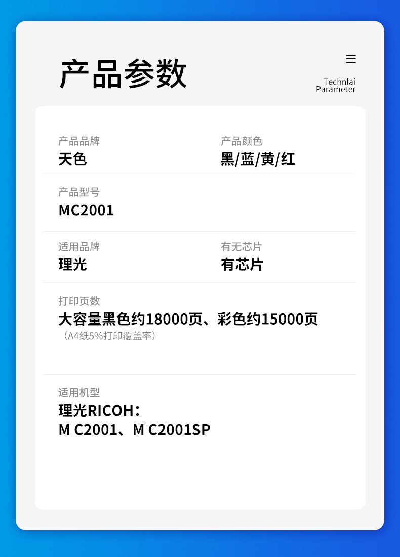 天色(15000頁)M C2001藍色粉盒適用于理光M C2001ew墨粉盒打印機硒鼓粉盒墨盒C2001 MC2001大容量藍色
